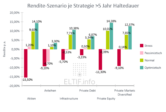 Für die Betrachtung der ELTIF-Fonds wurden diese der jeweiligen Private-Market-Kategorie zugeordnet und der Durchschnitt der jeweiligen Szenarien gebildet. Einzelne ELTIF-Fonds haben demzufolge eine höhere oder niedrigere Renditespannweite als die gebildeten Peer Groups. Die konkreten Werte für jeden einzelnen Fonds können auf ELTIF.info nachvollzogen werden.