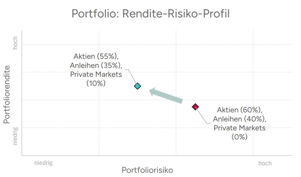 Schematische Darstellung der Optimierung des Rendite-Risiko-Profils durch die Beimischung von Private Markets.